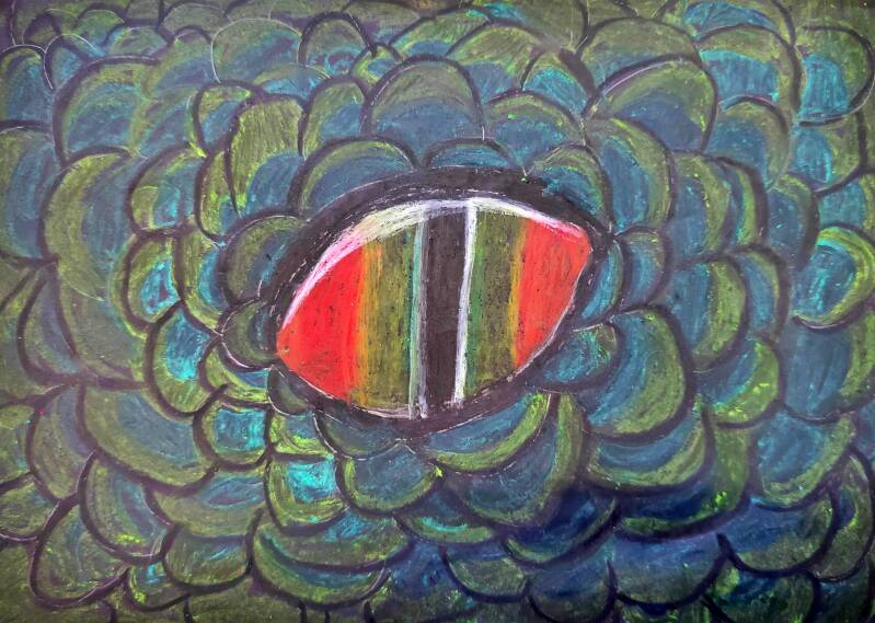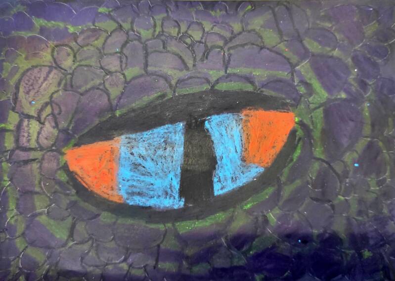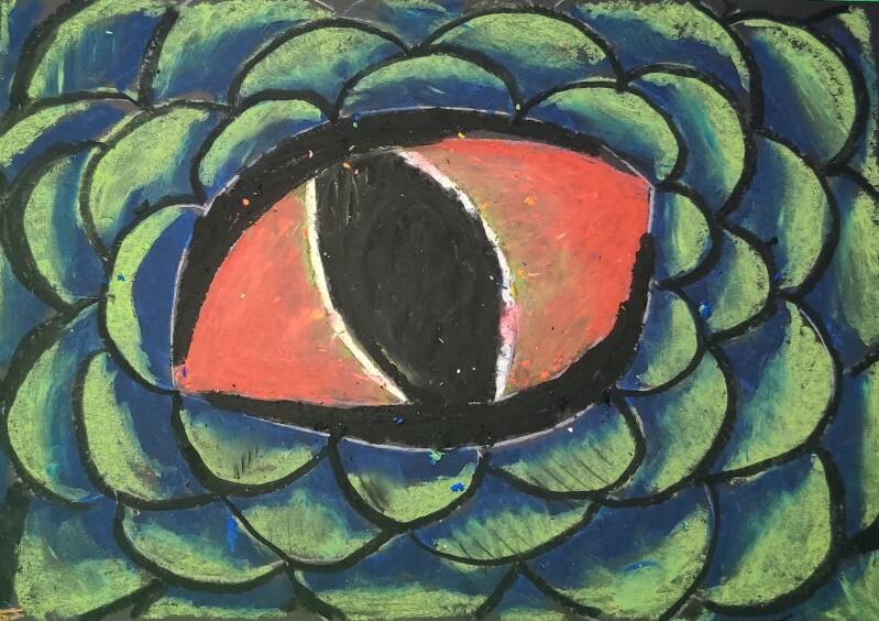 Stap 4: Aan het einde kun je met je vinger of een papiertje het krijt van de schubben en het oog voorzichtig vervagen en in elkaar laten overlopen. Gebruik een zwarte kleur om alle schubben, de pupil en de oogleden te omlijnen.