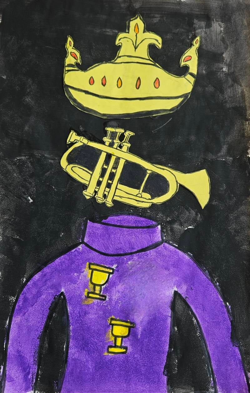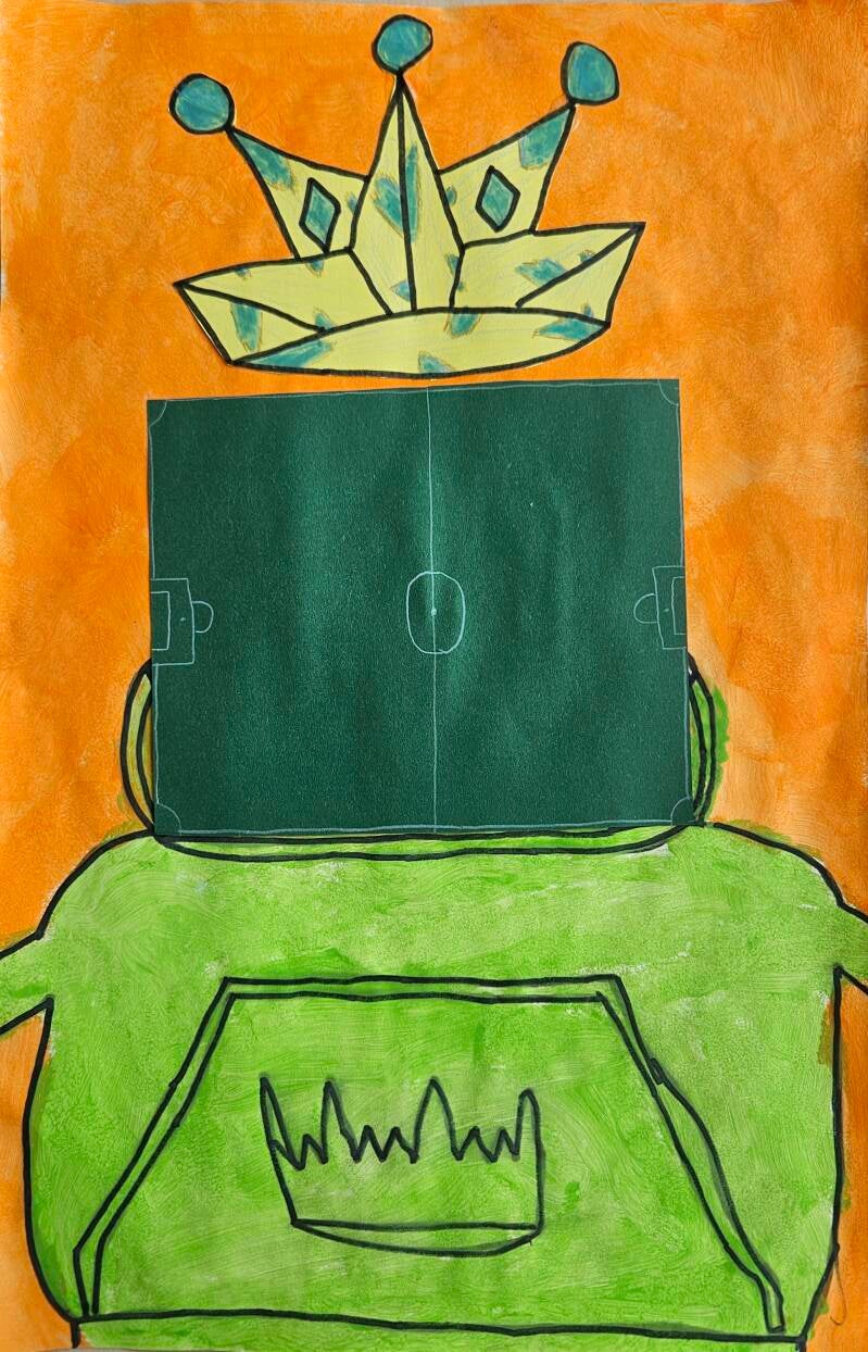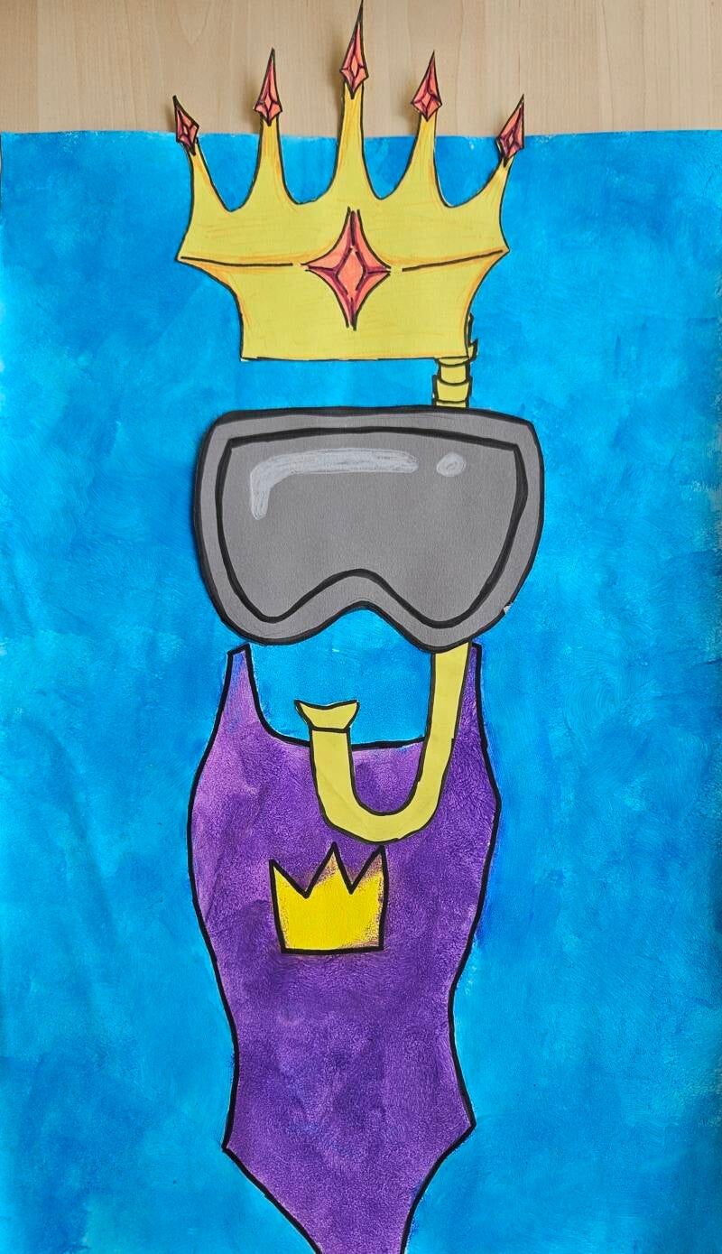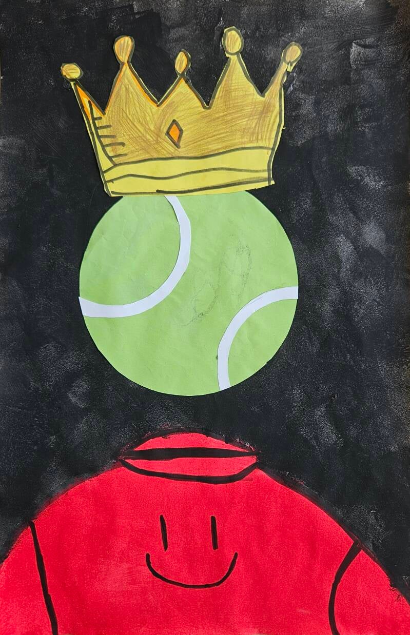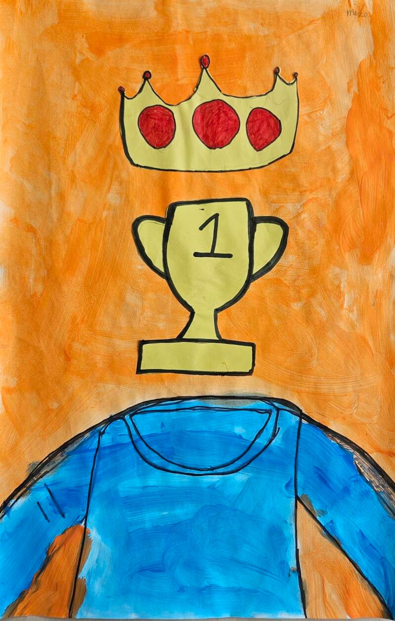- Als de verf droog is, plak je de kroon en het sportvoorwerp op de achtergrond.
