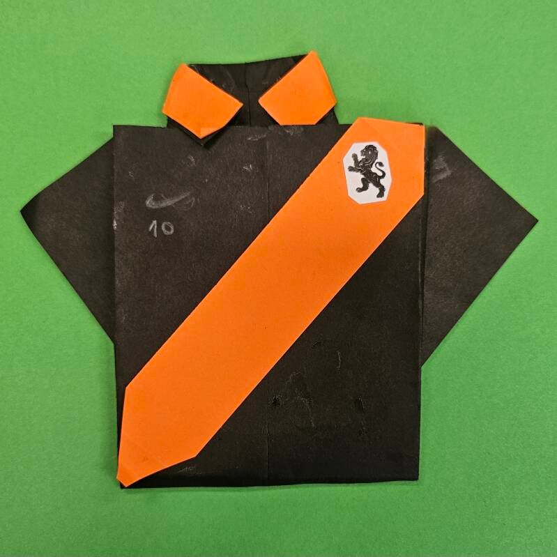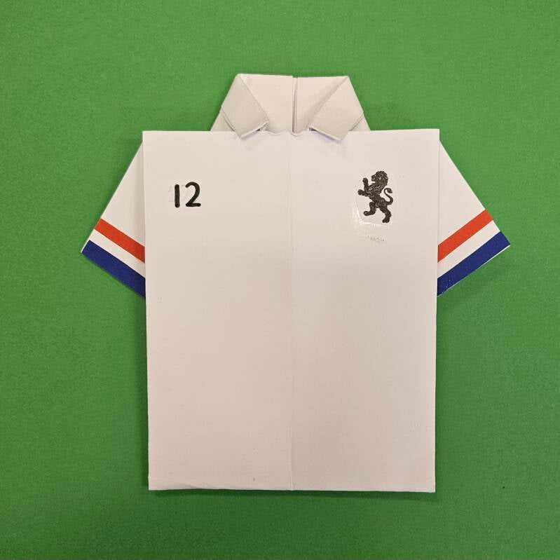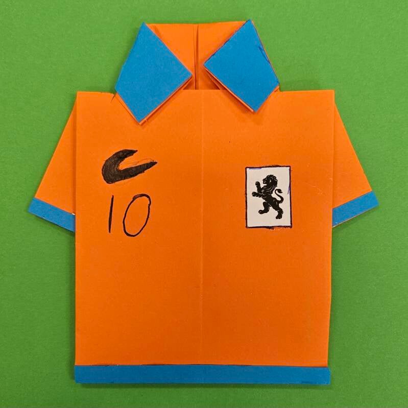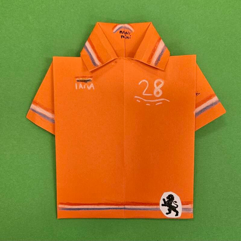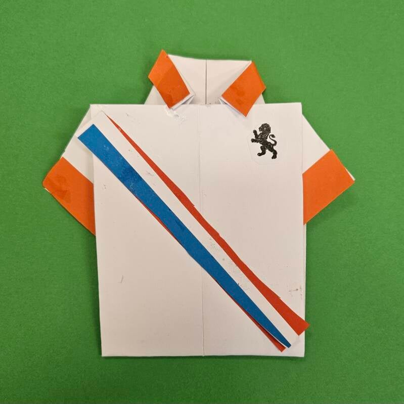 Ontwerp je tenue: Nu begint het leuke gedeelte! Gebruik je tekenspullen om het gevouwen shirt te decoreren. Denk aan de kleuren van de Nederlandse vlag, iconische symbolen, of misschien wel een vernieuwende look die je graag zou zien op het veld. Het is jouw kans om een uniek en opvallend tenue te creëren.