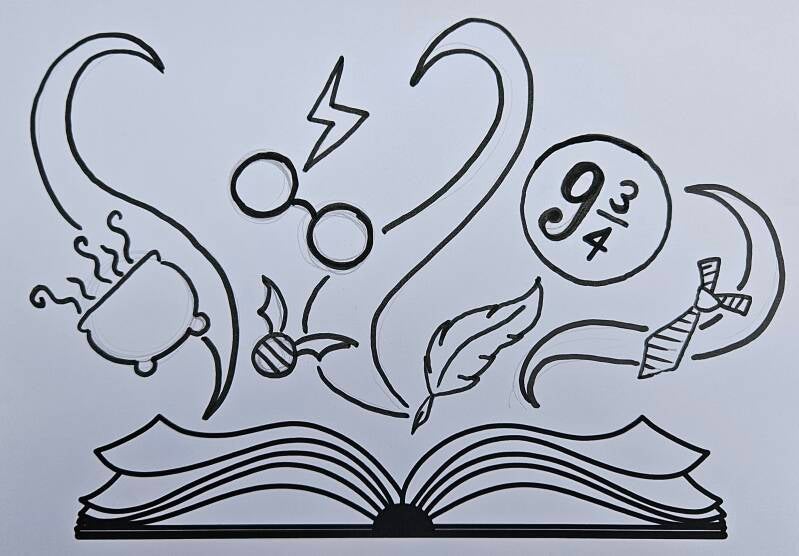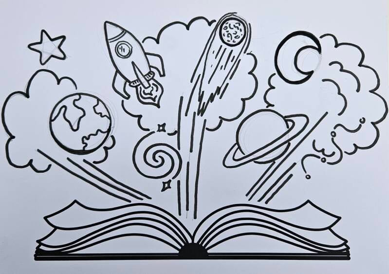 Download en print het opengeklapte boek (te vinden bij de materialen). Schets je gekozen tekeningen boven het boek, zodat het lijkt alsof ze eruit springen.