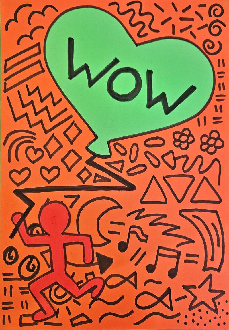 Maak een vrolijk kunstwerk met een poppetje en een hartjesballon, geïnspireerd op de stijl van Keith Haring. Met felle kleuren, simpele vormen en speelse lijnen geef je een positief woord een plek in je kunstwerk. Een creatieve knutsel vol energie, beweging en liefde!