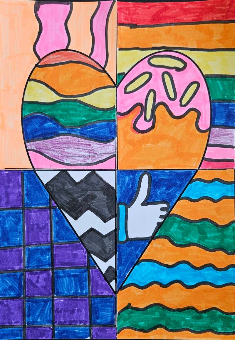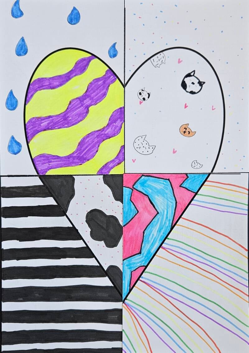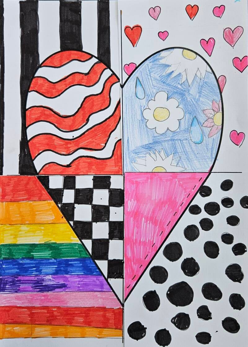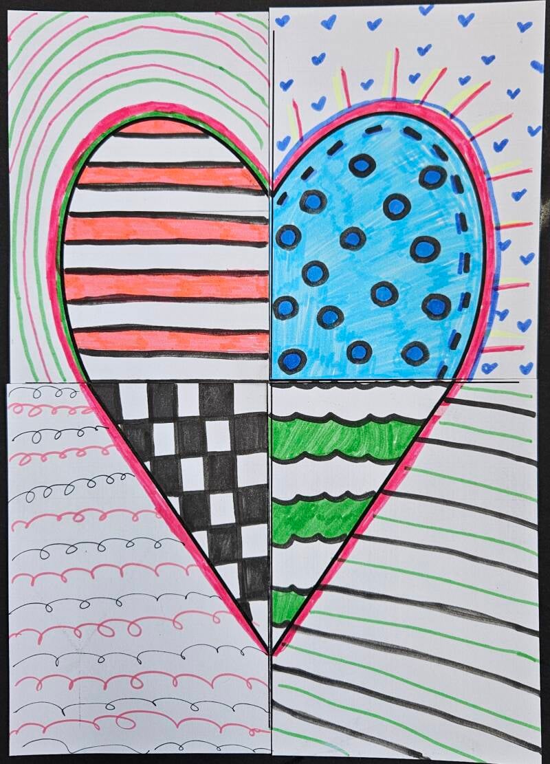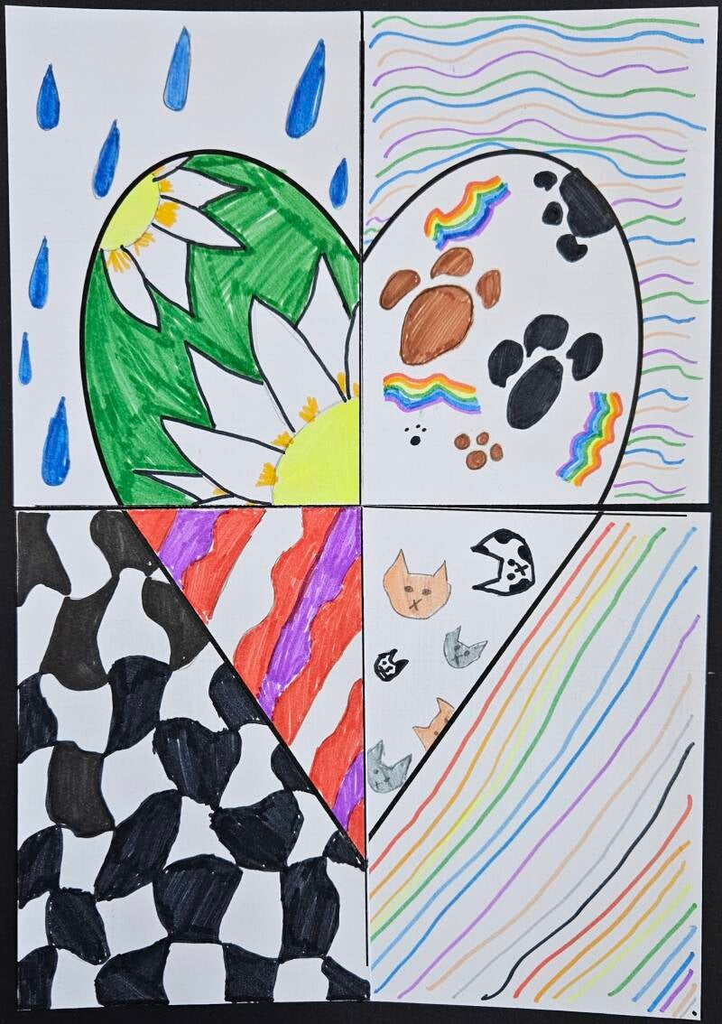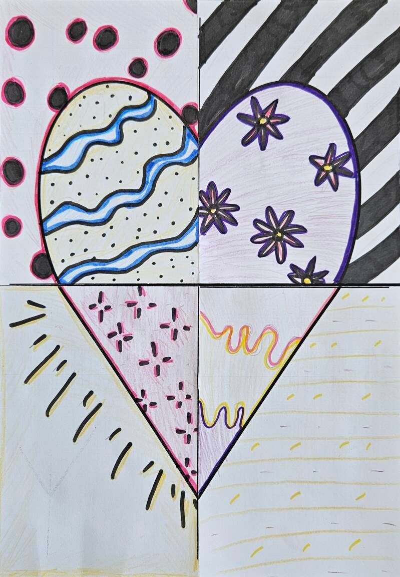 Knip, kleur en versier een hart dat in vier kwarten verdeeld is. Elk kwart krijgt zijn eigen patronen en vormen, en samen vormen ze één vrolijk en liefdevol kunstwerk. Perfect om creatief aan de slag te gaan en je hart te laten spreken!