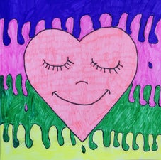 2. Teken op de achtergrond van het hart drie kronkellijnen van links naar rechts. Deze lijnen stellen kleuren verf voor die naar beneden druipen. Je kunt hierbij inspiratie halen uit de stijl van kunstenaar Dasic Fernandez.