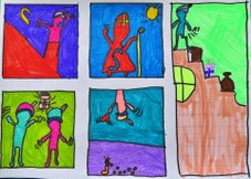 Stap 8: Maak de figuurtjes, voorwerpen en achtergrond levendig door ze in te kleuren met felle kleuren.